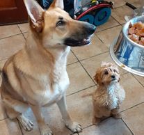Coco has learned very quick about giving the paw - she even gave both paws for treats in this photo.